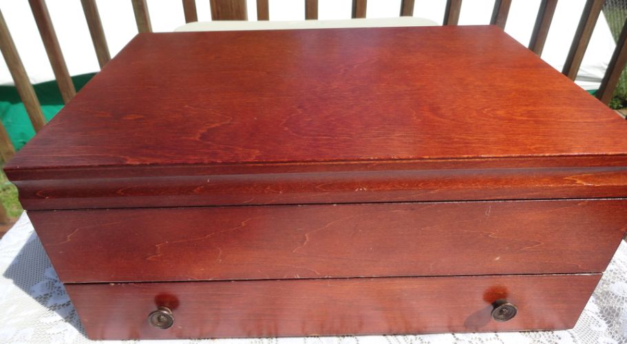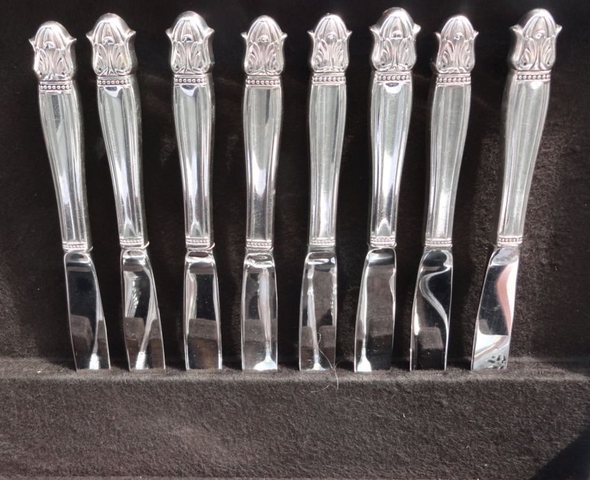 The pieces in this offering are new old stock, uncirculated, never used. They have practically no oxidation and will be shipped without any additional polishing to preserve original patina in its original anti-tarnish Pacific Silver Cloth lined mahogany finish wood storage chest with drawer.