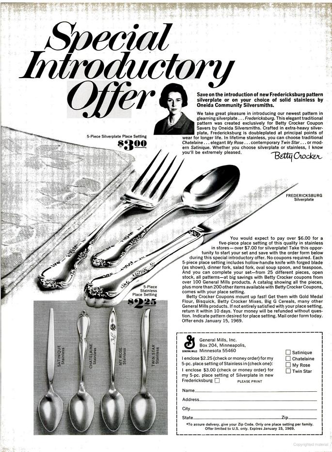 Special flatware promotions in stores, gas stations and on other products. Silverware could be purchased by collecting coupons from products like Betty Crocker, at in-store promotions, or with stamps issued for gasoline purchases at service stations, with Green Stamps in particular. Beauty shops, hardware stores, supermarkets and ladies magazines also participated in promotions featuring silver flatware as seen in this newspaper advertisement, and this Betty Crocker magazine advertisement from 1968 for the Fredericksburg silver plate pattern.